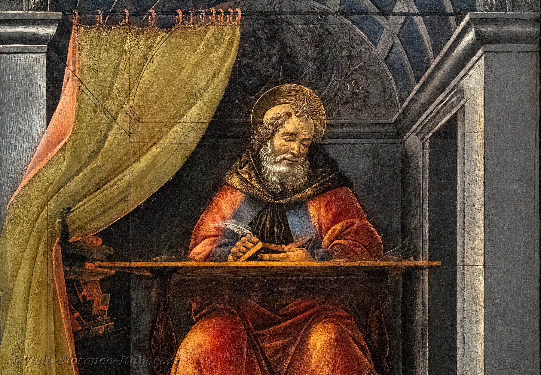 Augustine's carefully woven orange-red tunic warms the atmosphere of the scene, while the folds of its fabric allow Botticelli to play with light and shadow, thus giving this rather austere scene a touch of colour and life.